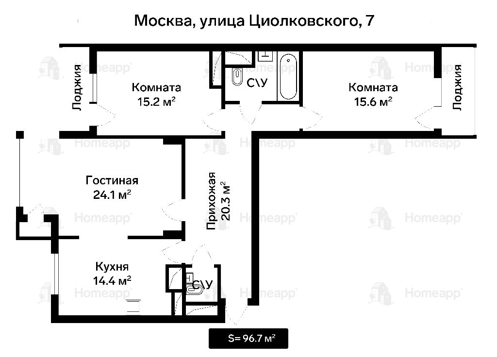 Номер лота: 97188. К продаже предлагается 3-комнатная квартира общей площадью 96,7 м2 на 7 этаже 20-этажного монолитного-кирпичного дома ЖК "На Циолковского".